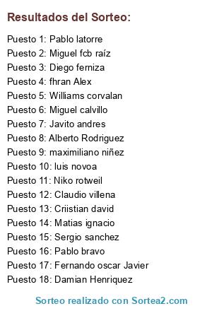Lista de participantes: Criistian david, fhran Alex, luis novoa, Alberto Rodriguez, Niko rotweil, Fernando oscar Javier, Miguel fcb raíz, Matias ignacio, maximiliano niñez, Damian Henriquez, Miguel calvillo, Diego ferniza, Sergio sanchez, Pablo latorre, Pablo bravo, Javito andres, Claudio villena, Williams corvalan.
