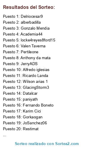 Lista de participantes: Salva pani, Jairovic, Triarius, El nene 2000, Rodrigo F.C, Alberto el torto, HUGATO07, Datalcar, D Raffael, Anthony da mata, El Sabritas, woopertje, Gabi Umpierrez, Pertileone, Han111, Fernando Boneto, locke4reyes8ford15, Alfredo iglesias, leoperezuy10, Ricardo Landa, Gonzalo Mendia, FABREGAS PROMO, John huaman, Delriocesar9, Valen Taverna, Restimat, Hugo marcel Carrasco, jeffro davies, Wilson arias 1, Karim Cici, Froi_2014, alberbadilla, paniyath, Academia44, Sir.EDGAR, deybisarayar, Creador de futbol, El mono0212, JoSanchez06, JerryADS, GlacingStorm3, Fabri jose Gonzalez, proffesor B, Salvador adame, Sergiocam098, Cristián per, EL KRIPPY MARIO, Gorkaogan.