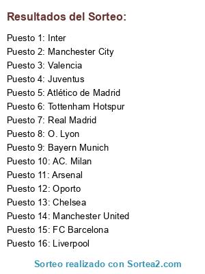 Lista de participantes: Real Madrid, FC Barcelona, Chelsea, Manchester City, Manchester United, Liverpool, Arsenal, Inter, AC. Milan, Bayern Munich, O. Lyon, Atlético de Madrid, Juventus, Oporto, Valencia, Tottenham Hotspur.