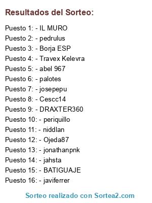 Lista de participantes: - IL MURO, - jahsta, - Travex Kelevra, - abel 967, - DRAXTER360, - BATIGUAJE, - Borja ESP, - Ojeda87, - Cescc14, - javiferrer, - josepepu, - pedrulus, - jonathanpnk, - niddlan, - periquillo, - palotes.