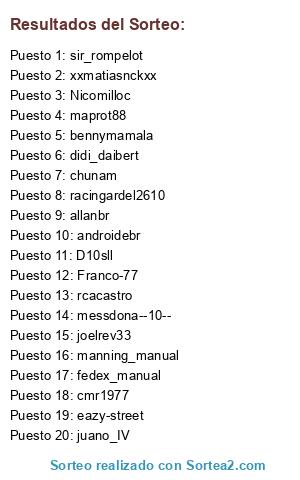 Lista de participantes: Nicomilloc, rcacastro, D10sll, joelrev33, juano_IV, Franco-77, chunam, bennymamala, manning_manual, xxmatiasnckxx, fedex_manual, androidebr, maprot88, messdona--10--, eazy-street, allanbr, cmr1977, sir_rompelot, racingardel2610, didi_daibert.