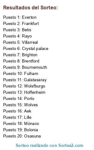 Lista de participantes: Besiktas, Galatasaray, Mainz, Frankfurt, Borussia MG, Hoffenheim, Wolsfburgo, Osasuna, Celta, Getafe, Rayo, Betis, Villarreal, Mónaco, Lille, Marsella, Niza, Lyon, Lens, Rennes, Bournemouth, Brentford, Brighton, Crystal palace, Everton, Fulham, West ham, Wolves, Bolonia, Fiorentina, Torino, Ajax, Feyenoord, Porto, Braga, Aek.