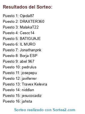 Lista de participantes: IL MURO, jahsta, Travex Kelevra, abel 967, DRAXTER360, BATIGUAJE, Borja ESP, Ojeda87, Cescc14, javiferrer, josepepu, pedrulus, Jonathanpnk, niddlan, MalakaT22, jesucocadiz.