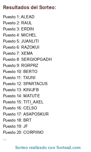 Lista de participantes: SPARTACUS, FREDYSBD, ASAPOSKUR, KINIJFB, RAUL, ERDIN, RGRPRZ, SERGIOPGADH, BRT, TITI_AXEL, RAZOKUI, JOSETP, CORPIINO, JF, MATUTE, XEMA, JUANLITI, ALEAD, TXUNI, MICHEL, JOSE, MELLI, BERTO, CELSO.