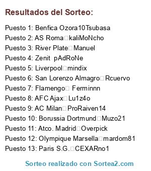 Lista de participantes: Valencia Amonospare, AC Milan ProRaiven14, Paris S.G. CEXARno1, Saint Ettiene eckae, Racing Club Emilio Ucha, Flamengo Ferminnn, Benfica Ozora10Tsubasa, Leipzig ipillo, Olympique Marsella mardom81, AS Roma kaliMoNcho, AFC Ajax Lu1z4o, Liverpool mindix, River Plate Manuel, Atco. Madrid Overpick, Barcelona Maxisrael2005, Borussia Dortmund Muzo21, San Lorenzo Almagro Rcuervo, Monaco J sego, Zenit pAdRoNe, Olympique Lyon osdobla89.