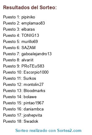Lista de participantes: daniambca, SAZAM, Bloodmarks, joshepvita, pintao1967, PRoTEuS83, pipiniko, Escorpio1000, Swadok, alvariit, murillo69, TONIG13, Surkos, gaboalejandro13, bolawe, emplamao83, elbaras, montolin27.