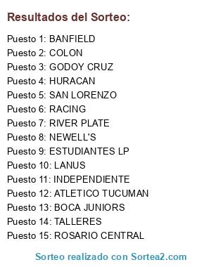 Lista de participantes: BOCA JUNIORS, RIVER PLATE, INDEPENDIENTE, RACING, SAN LORENZO, HURACAN, LANUS, BANFIELD, TALLERES, GODOY CRUZ, COLON, ESTUDIANTES LP, NEWELL'S, ROSARIO CENTRAL, ATLETICO TUCUMAN.