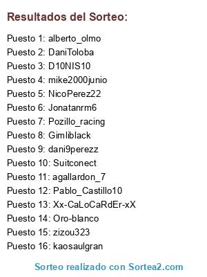 Lista de participantes: Oro-blanco, Suitconect, D10NIS10, Xx-CaLoCaRdEr-xX, Gimliblack, Jonatanrm6, Pozillo_racing, mike2000junio, zizou323, dani9perezz, Pablo_Castillo10, kaosaulgran, DaniToloba, agallardon_7, NicoPerez22, alberto_olmo, .