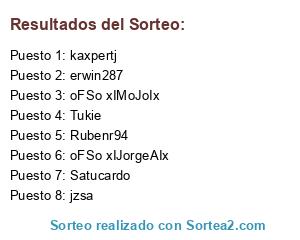 Lista de participantes: Tukie, erwin287, oFSo xIJorgeAIx, Satucardo, kaxpertj, jzsa, oFSo xIMoJoIx , Rubenr94.