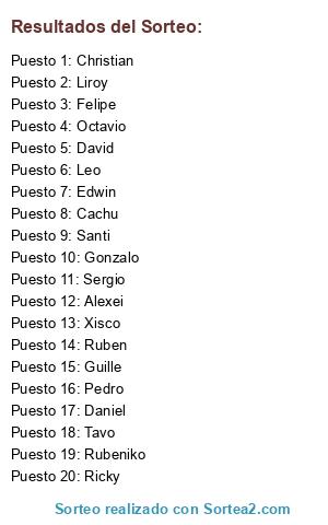 Lista de participantes: Ricky, Leo, Tavo, Guille, Gonzalo, Christian, Pedro, Octavio, Sergio, Liroy, Xisco, Ruben, David, Rubeniko, Cachu, Alexei, Daniel, Santi, Edwin, Felipe.