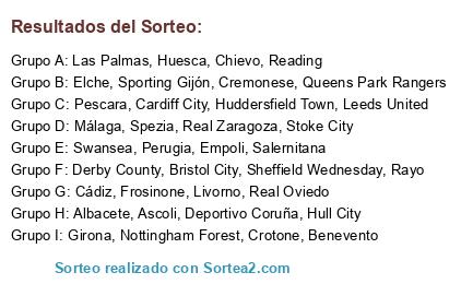 Lista de participantes: Albacete, Cádiz, Elche, Sporting Gijón, Girona, Huesca, Deportivo Coruña, Las Palmas, Málaga, Real Oviedo, Rayo, Real Zaragoza, Ascoli, Benevento, Chievo, Cremonese, Crotone, Empoli, Frosinone, Perugia, Salernitana, Livorno, Pescara, Spezia, Bristol City, Cardiff City, Derby County, Huddersfield Town, Hull City, Leeds United, Nottingham Forest, Queens Park Rangers, Reading, Sheffield Wednesday, Stoke City, Swansea.