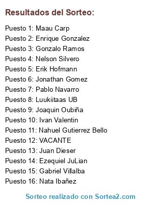 Lista de participantes: Juan Dieser, Pablo Navarro, Erik Hofmann, Gonzalo Ramos, Jonathan Gomez, Nelson Silvero, Nata Ibañez, Joaquin Oubiña, Enrique Gonzalez, Ivan Valentin, Gabriel Villalba, Luukiitaas UB, Ezequiel JuLian, Maau Carp, Nahuel Gutierrez Bello, VACANTE.