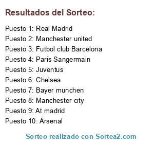 Lista de participantes: Futbol club Barcelona, Real Madrid, Juventus, Manchester united, Manchester city, At madrid, Bayer munchen, Paris Sangermain, Arsenal, Chelsea.