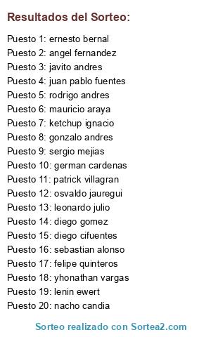 Lista de participantes: diego cifuentes, ketchup ignacio, yhonathan vargas, ernesto bernal, nacho candia, angel fernandez, diego gomez, leonardo julio, lenin ewert, patrick villagran, javito andres, sebastian alonso, gonzalo andres, felipe quinteros, mauricio araya, rodrigo andres, osvaldo jauregui, sergio mejias, juan pablo fuentes, german cardenas.