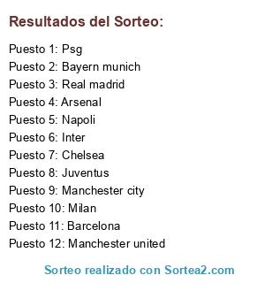 Lista de participantes: Manchester city, Manchester united, Psg, Juventus, Bayern munich, Real madrid, Barcelona, Milan, Arsenal, Chelsea, Napoli, Inter.