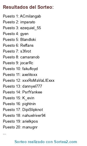 Lista de participantes: s3firot, imparato, Blandloki, mati0extremo, K_evin, nahuelriver94, arielkpos, xxxRoMaVaLlExxx, ezequiel_55, el_diego_akd, DipiSlipknot, Minors12, ACmilangab, jocarRc, SinRitmo, claudio33, LDSwilm3r:, PsrfYankee, camaranob, Reffans, axelitoxx, Omerto, RicardoGA, dannyel777, marcosaww, D4rCkAr, TheJulianXBOX, pightnin, gyen, fakufloyd, jotero15, manugnr.