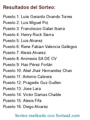 Lista de participantes: Victor Damas Chable, Alexis Alvarez, Antonio Cabrera, Henry Rock Sierra, Animexis SA DE CV, Luis Miguel Prz, Jose Lara, Franciiscoo Galan Ibarra, Pragedix Guz Guillen, Diego Alvarez, Hao Pérez Forlán, Luiis Gerardo Ovando Torres, Abel Jhair Hernandez Chan, Rene Fabian Valencia Gallegos, Luis Alvarez, Alexis Fifa.