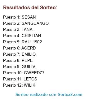 Lista de participantes: ACERD, CRISTIAN, EMILIO, GUILIVI, GWEED77, LETOS, RAUL1902, SANGUANGO, PEPE, TANA, WILIKI, SESAN.