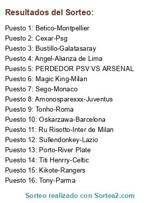 Lista de participantes: Sego-Monaco, Kikote-Rangers, Cexar-Psg, Titi Henrry-Celtic, Sullendonkey-Lazio, Tonho-Roma, Bustillo-Galatasaray, Ru Risotto-Inter de Milan, Amonosparexxx-Juventus, Tony-Parma, Porto-River Plate, Betico-Montpellier, Angel-Alianza de Lima, Oskarzawa-Barcelona, Magic King-Milan, PERDEDOR PSV VS ARSENAL.