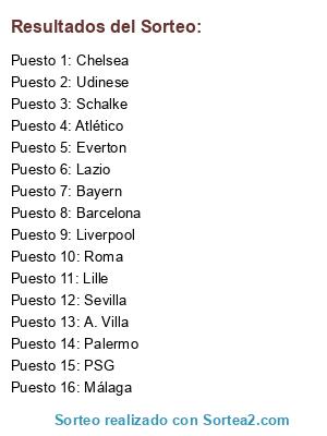 Lista de participantes: Málaga, Atlético, Barcelona, Sevilla, Liverpool, Everton, Chelsea, A. Villa, Palermo, Roma, Udinese, Lazio, Schalke, PSG, Lille, Bayern.