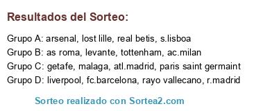 Lista de participantes: tottenham, s.lisboa, lille, fc.barcelona, r.madrid, levante, m.city, atl.madrid, ath.bilbao, b.munich, granada, ac.milan, valencia, chelsea, m.united, fiorentina.