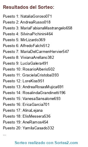 Lista de participantes: ClaudiaAguilar149(3), MariaAlejandraOggero796(3), VivianaEtchegoyen029(3), MabyAznar632(3), SilviMorales270A(3), MajoLammenda021, ALejandraAbbatantuono725, VivianaD'Albano509(3), MarielaAleiram551, JoannaFleitas624(3), VanesaMazettelle791, BrendaA.Cortez983(3), SabinaEsqueche183, PaulaInda806(3), AgustinaPerezIglesias189(3), DessyMa047, LilianaLabeque739(3), MaraHerreraKessler646, ClaraGiaquinto441, GriseldaGarrido223(3), PersidaBarbosaDosSantos326(3), SoledadUrrutia542(3), CarolinaPardal569(3), NataliaGrosso688, AnaMaurinaValdez598, IviMorbidoni978, MariaGaleano947(3), AidaFernandaBenitez826(3), AnaPaulaDonofrio654(3), RosaliaFulcos322, ValeriaMarianaLani334(3), AnaAngelesDuarte303, NancyDiMauro439, YazminPortas894, LauraGV938(3), MariaMartaMorel430(3), SandraOrr554, IkerneMato078, YaninaCabrera700, NataliaACh312, MaríaLauraSaldumbere166(3), SabrinaAlvarez662, MariaDelCarmenHervier547, YamilaCasado332(3), RosaEstelaDiaz609, FlorenciaReyes200, MariaLauraParedes612(3), IsabelTarcayChabela983, InesRasadore930, NataliaPaciotti 050(3), VeronicaGimenezMazzanti040, FreireGabriela719, LucíaGalera491, VictoriaEstefaniaRodriguez392(3), FlabianaDebiasiPolito(3), NataliaRamundo394, GeriNogales067, MaFatimaFerre695, AndreaZamora369, RominaAccentini000, MeliiLourdesCarreras818...(3), MatildaRominaDiseño234, NeriBlanco881, YamilaAnabel694(3), EmilianaMarquez000, RomyMorales730(3), MarielaPolvorin343(3), MariaCeciliadeVega715, MariaRosaCampoamor161(3), FelisaTatulli145, MariaLisaPravato371(3), AdrianaGuazzetti724, SusanaJusto843(3), MaireSalgán407, CrisMar346(3), KarinaMartinez828, MirLizardo369(3), NataliaAlvarez000, AlinaLejana(3), Claudia,762, RominaRossi955(3), SaraBellagamba584, PatriciaFernandez695, CintiaPamelaVentrici544(3), BelénPalmieri920, AndreaMacheroni634, DanielaAlejandra141, AneRamos454(3), MarielaSacotegui471, KrisBorgna600(3), NataliaCironi005(3), AgustinaGarcia972, NancyAlmada044(3), VivianaTileria725, AntonellaDeLazzari079, CaroCarito365(3), PatriciaAlejandraArnedo470, RosarioAbarca289, MariaLauraFacio938, CintiaScholz536(3), NelidaChambers146, VictoriaVertiz057(3), RoxanaPerez652(3), MIryamYendilotto487, LorenaMarinoLorenaMarino776, AyelenAtencio618, LucianaAraújo116(3), JorgelinaDerochi629(3), VeroMontes540, AnabellaLadeuix335, MercedesMorales625(3), VirginiaMassabo217, ClaritaAvilés795, MariaMariño620(3), MonyAlegre305, FlorMazzotta491(3), RomiBona654(3), SofíaGennoso137(3), MaEmilia658, GladysSanchez026, YaninaCallegari532(3), MarcelaSanchez353, MerliUrrutia936, SilvinaA.Gauna617(3), MariaPaulaAriño067, CarlaChiara194, AnahiRuggiero688, AgustinaSimo447, PatriciaCejas740, FernandaPidalMagno813(3), PaulaFeldman567(3), LuchyRBz248(3), RominaLani030, MariaVictoriaRonchi067, PaoPrestes711, MariaCristinaForell451, XimenaVulcano330, AgustinaLarrañaga492(3), RoxanaFemia621, VeroPliaco993, RominaPiaggiodni.323(3), SilvinaPichinini464, CristinaReimundo620, DeboIbarra276, RomiiCarpOrdosgoyty808, JimenaBeasi895, JuliMillet534(3), JohannaTournoud209, MelisaMaidana441(3), AndreaRosasMujica691(3), RutMarini322, AyelenGarcia789, TeresaGrebol980(3), BettinaRolón045(3), VaninaElena876(3), AliciaFloresdeLupo627, MariaVictoriaPardo353, EricaMuñoz398, BalbyGonzalez308, TamaraBaez346, SilviaBenzo768, AlejandraJimenez230, MariaFernandaRossi130, SolciréAlfa042, VanesaSansalone693, FernandaArias015(3), EricaSabrina959(3), AntonelaGomez850, NataliaMdq944, SolangeMartinez892, NellyIvonMartinez153, DanielaPonce556(3), AniPucineri534, SilvinaQuiroga512, PaulaGariador044, DanielaRiadigos114, BelénDíaz111, NoraVega 636(3), PamelaAguilera067, VerónicaPezzente320, VeroOrtiz098(3), GracianaFrancisco045(3), EvelinaGonzalez664, KarinaLuciaFernández313, GracielaCristobal393, AngieWagner152, MarianaZanatta868, GabrielaBarbero170(3), MagaliHardoy944, CarlaCarmikokoa411(3), OlgaLio218, SoledadPerezRojas694, MarielaCambados993(3), CristinaCasco522(3), EstelaJusto996(3), AlejandraRomero005, ChechuBelen671, LujanBarros105, RocioFernández134(3), MariaJoseMora206coser1, DaiiChu958, MaraJimenaMara277, MaríadeSolay829, RoxyPreussler527(3), AndreaRusso018(3), PatriciaDego590, CarmenRayas261, CrisPonce551, LilianaRomulo910(3), CristinaLi135, AndreaFarias107(3), FerDiaz999, LeticiaClaraPierini 588, InesLabrunee758, NoemíGuzmán361(3), ValeriaLaterza920(3), SilviaGracielaSantamarina 106, SilviaFulco970(3), AneRamosYannRubilar(3), MelisaSosa865, VanesaEditMaenza152(3), LolyZuviarrain909, LidiadeVega504, RocioGoyaRocío490, PaulaIssa305(3), SandyAlvidrez147, BettyOsso792, NatyGimenez847(3), JimenaIslas792, MariaEmaHiriart135, SolValiñas907(3), GabyPetta326(3), RaveVeronica225, MarielaLopez973, MacarenaGodoy691, CeciliaLatino218, OlgaIsabelRey318, VanesaDelValleVanesa485, NataliaGoroso071, RosarioAlberio502, MaríaEugenia153, EricaGarcia701, GisellaCzajkowski777, ElisMessera536(3), ClaudiaMárquez883(3), VanesaVictoria626, GabyLopez864(3), YannRubilar172(3), MariaNoriegaGarcia647, MaryanaGavilanAlfonso234, VeronicaGonzalezSummertime035, VivianaArellano382, KarinaClaverie359(3), GabrielaValderrey666(3), AndreaPaola610(3), SoledadMonzon531(3), MariaBiasi139, JorgelinaRossi465, MariaFabianaMastrangelo658(3), AlejandraAmado001, CarinaAdránMCarina.644, MarinaCarranza088, BarbiBozzalla291, LizSoledadMolina776(3), NanuDeVacaQuintana786, MiryanQuintana768(3), RosalindaGrandinetti196(3), SilShmitd243, LucianaMartinucci876(3), LilianGonzalez046, AgustinaPascua030, LorenaGayo439, MonicaUrdangaray960, AnitaPeki619, SusanaChumilla362, SilviaGonzalez324, LoreKiss951, MaríaAliciaCucchiColleoni423(3), MarcelaVallejos487, GabrielaElisabethdeFelice272(3), CristinaDiCarlo359(3), CarolinaGiovannetti076, SoledaddeVera282(3), VivianaMónicaMaffezzoli364, RosanaSchifini956, VeronicaBarragan979, MaríaSolCheMaría909, FlorUB989, SolGimenez378(3), FernandaMolina 390, AnaMariaSusino907, KarinaGracielaPriede776, BelenOroMuro837(3), GabyMartinez, AngelicaHernandez323, ManuSalto001, ClaudiaMOchoa195, MarilynArosa