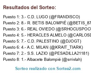 Lista de participantes: 1.- Albacete Balompié (@srrivlah), 2.- S.S. LAZIO (@PESADILLA21181), 3.- C.D. LUGO (@FRANDISCO), 4.- A.C. MILAN (@KRAIT_TIARK), 5.- HERACLES ALMELO (@CARLOSDURAN0), 6.- REAL OVIEDO (@SRHOCUSPOCUS), 7.- C.D. PALESTINO (@DJOGT), 8.- R. BETIS BALOMPIÉ (@BETIS_87).
