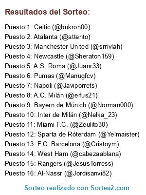 Lista de participantes: Manchester United (@srrivlah), Rangers (@JesusTorress), A.C. Milán (@elfus21), West Ham (@cabezaablana), Pumas (@Manugfcv), Bayern de Múnich (@Norman000), A.S. Roma (@Juanr33), Napoli (@Javiporrets), Newcastle (@Sheraton159), Celtic (@bukron00), Miami F.C. (@Zeulito30), Al-Nassr (@Jordisanvi82), F.C. Barcelona (@Cristoym), Inter de Milán (@Nelka_23), Sparta de Róterdam (@Yelmaister), Atalanta (@attento).