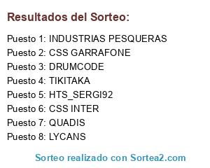Lista de participantes: DRUMCODE, TIKITAKA, HTS_SERGI92, CSS INTER, INDUSTRIAS PESQUERAS, LYCANS, CSS GARRAFONE, QUADIS.