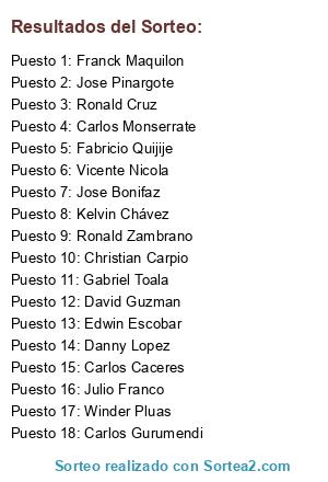 Lista de participantes: Carlos Monserrate, Ronald Cruz, Winder Pluas, Edwin Escobar, Gabriel Toala , Jose Bonifaz, Ronald Zambrano, Christian Carpio, Carlos Gurumendi, David Guzman, Franck Maquilon, Kelvin Chávez, Carlos Caceres , Jose Pinargote, Julio Franco, Fabricio Quijije, Danny Lopez, Vicente Nicola.