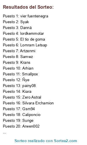 Lista de participantes: aiden(2 participaciones), Airam, Alexo, Arhian, Artzenmi(5 participaciones), Arwen002, AtrumShaton, bamsu(2 participaciones), Blackfish(2 participaciones), Caliponcio(3 participaciones), Carlusss(2 participaciones), corraler, Dannä(3 participaciones), Devan82, Druk, Duarah, Edu Aldo(5 participaciones), El tio de goma(3 participaciones), Genzor22, Gsm94, Inffy, Kastiel.4970, KerHac(2 participaciones), Kiara(3 participaciones), Krans, Laitale, Lomram Letsap(2 participaciones), lordkemmotar(19 participaciones), MaSi(2 participaciones), Migg(3 participaciones), Ñye(2 participaciones), painy08(4 participaciones), phicode, Quail, quimicoloco(3 participaciones), Samwz(25 participaciones), shinjuiko(7 participaciones), Silvara Erchamion, Smallpox(3 participaciones), Soldier J, Sunge, Sute(2 participaciones), Syak(6 participaciones), Tharax, Tilien, Titan09(2 participaciones), Ulpio, vier fuentenegra(8 participaciones), Zero Astral(5 participaciones).
