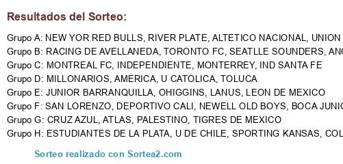 Lista de participantes: PALESTINO, U DE CHILE, U CATOLICA, COLO COLO, LANUS, ESTUDIANTES DE LA PLATA, RACING DE AVELLANEDA, TIGRES DE MEXICO, AMERICA, MONTERREY, IND SANTA FE, MILLONARIOS, ALTETICO NACIONAL, RIVER PLATE, BOCA JUNIORS, INDEPENDIENTE, CRUZ AZUL, LEON DE MEXICO, SEATLLE SOUNDERS, ANGELES GALAXY, NEW YOR RED BULLS, NEWELL OLD BOYS, DEPORTIVO CALI, ATLAS, SPORTING KANSAS, TORONTO FC, TOLUCA, SAN LORENZO, UNION ESPAÑOLA, MONTREAL FC, OHIGGINS, JUNIOR BARRANQUILLA.