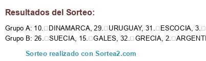 Lista de participantes: 1. ALEMANIA, 2. ARGENTINA, 3. AUSTRIA, 4. BELGICA, 5. BRASIL, 6. CAMERUN, 7. CHILE, 8. COLOMBIA, 9. COSTA DE MARFIL, 10. DINAMARCA, 11. ECUADOR, 12. ESPAÑA, 13. EEUU, 14. FRANCIA, 15. GALES, 16. HOLANDA, 17. INGLATERRA, 18. ITALIA, 19. MEXICO, 20. POLONIA, 21. PORTUGAL, 22. REPUBLICA DE IRLANDA, 23. REPUBLICA CHECA, 24. RUMANIA, 25. RUSIA, 26. SUECIA, 27. SUIZA, 28. TURQUIA, 29. URUGUAY, 30. EGIPTO, 31. ESCOCIA, 32. GRECIA.