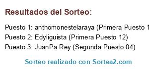Lista de participantes: anthomonestelaraya (Primera Puesto 11), Edyliguista (Primera Puesto 12), JuanPa Rey (Segunda Puesto 04).