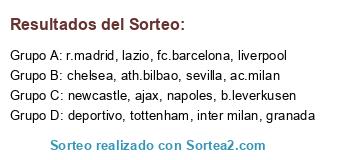 Lista de participantes: tottenham, chelsea, fc.barcelona, newcastle, ac.milan, r.madrid, lazio, inter milan, napoles, ajax, ath.bilbao, b.leverkusen, deportivo, sevilla, liverpool, granada.