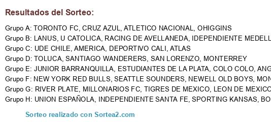 Lista de participantes: COLO COLO, UDE CHILE, U CATOLICA, SANTIAGO WANDERERS, OHIGGINS, UNION ESPAÑOLA, BOCA JUNIORS, RIVER PLATE, RACING DE AVELLANEDA, LANUS, SAN LORENZO, NEWELL OLD BOYS, ESTUDIANTES DE LA PLATA, ATLETICO NACIONAL, DEPORTIVO CALI, INDEPENDIENTE SANTA FE, IDEPENDIENTE MEDELLIN, JUNIOR BARRANQUILLA, MILLONARIOS FC, SEATTLE SOUNDERS, ANGELES GALAXY, NEW YORK RED BULLS, SPORTING KANSAS, TORONTO FC, MONTREAL FC, AMERICA, MONTERREY, TIGRES DE MEXICO, TOLUCA, CRUZ AZUL, LEON DE MEXICO, ATLAS.