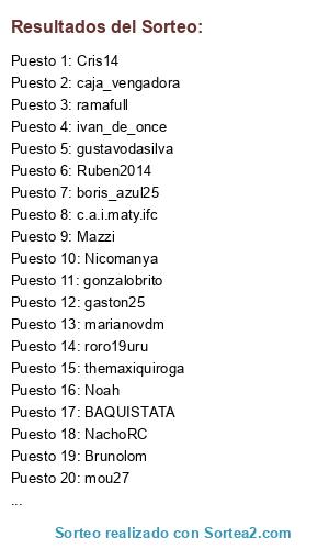 Lista de participantes: Nicomanya, OLLER, gonzalobrito, ivan_de_once, mou27, Tony23, NelsonLucybell, brandonsilveira, gabycai, ceccotti, marceloseifert, PIKU2010, enzofernandez7, Gegengue, c.a.i.maty.ifc, guasti, mattimolina, Ruben2014, maikoluru2, themaxiquiroga, Damiansan, Janito JL !, elburbuuh, MANJATO, Ariel_Rojo, fedinho, fitofarais, Turgon_04, Tin, boris_azul25, javier2527, ScaYra, davigolxD, Emicabe, EL_BETO_ACOSTA, Mazzi, pablomauro, Nikoo, chestermg, mdustt_dkl, chayan, rodri74, Brunolom, arku, marianovdm, Belgratias, bestianegraa, JuanKStigma, fedecarp17, NachoRC, santana, Edudel79, LDN, roro19uru, rembecuadro, gordocat, jorge-meler, DoFight, jona.fenomeno, kist2013, enrimaiden, Noah, matiasufc155, pellejunior, mati-gti89, Cris14, andresmoron, gustavodasilva, bardock, Maravilla8, Roman.D.W, panda.cabj, ramafull, cambur, famr1989, BAQUISTATA, noob, tony23, nicolasmathias, Ppe Penta, gaston25, Jeison, Self_Decedent, caja_vengadora.