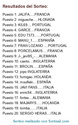 Lista de participantes: FRAN LOZANO ....PORTUGAL, SERGIO HERAS....ITALIA, EDU 7373.......PORTUGAL, PORCELAMUS.....FRANCIA, JAVI FANS......ITALIA, MAJARYS......HOLANDA, MANU_1......ESPANÑA, BROLIN......ESPAÑA, J-_javi95_-....ALEMANIA, migueche.....HLONADA, tomba.......ITALIA, caxito....INGLATERRA, fortex....ALEMANIA, GARCE....FRANCIA, pipo INGLATERRA, KIL69.... PORTUGAL, JALIFA.....FRANCIA, fumigao..HOLANDA, moufleki... ESPAÑA, enric94....INGLATERRA.