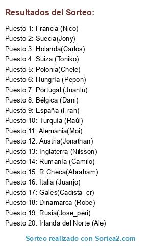 Lista de participantes: Francia (Nico), Rumanía (Camilo), Suiza (Toniko), Inglaterra (Nilsson), Rusia(Jose_peri), Gales(Cadista_cr), Polonia(Chele), Irlanda del Norte (Ale), R.Checa(Abraham), Turquía (Raúl), Bélgica (Dani), Italia (Juanjo), Alemania(Moi), Suecia(Jony), Portugal (Juanlu), Austria(Jonathan), Hungría (Pepon), España (Fran), Dinamarca (Robe), Holanda(Carlos).