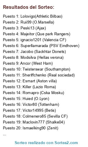 Lista de participantes: Victor14995 (Betis), Huied (O.Lyon), Spawntfe (Torino), Peski13 (Ajax), Ruii99 (O.Marsella), Kike398 (B.Leverkusen), Romapro (Cska Mosku), Twisterswar (Southampton), Victor80 (Tottenham), Podernegrito(Udinese), Lolovigo(Athletic Bilbao), Majeitor (Que park Rangers), ignacio1201 (Valencia CF), Ismaelking90 (Zenit), Gorri7 (Galatasaray), Esmart (Aston villa), Kinglosada (Stoke city), Superllamarada (PSV Eindhoven), Sheriffchenko (Real sociedad), Modsilva (Hellas verona), Luis22 (Villarreal), Bogarde9 (Saint Etienne), Jacobo (Sackhtar Donets), Ancor (West Ham), Lider2012 (Sporting Braga), Roqueluis (Español), Maclovin777 (Shalke04), Juanma641990 (Olimpiakos), Cortex (Monaco Ac), Killer (Lazio Roma), Javivale (Newcastle), Colmenero85 (Sevilla CF).