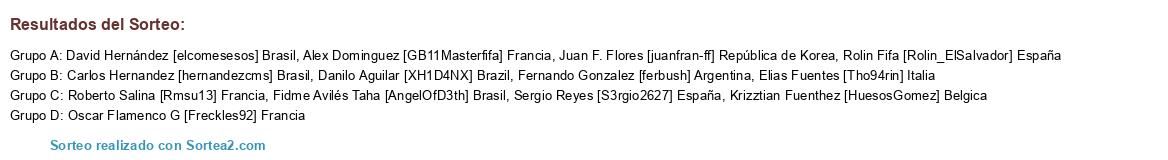 Lista de participantes: Krizztian Fuenthez [HuesosGomez] Belgica, Juan F. Flores [juanfran-ff] República de Korea, Carlos Hernandez [hernandezcms] Brasil, Fernando Gonzalez [ferbush] Argentina, Danilo Aguilar [XH1D4NX] Brazil, Oscar Flamenco G [Freckles92] Francia, Fidme Avilés Taha [AngelOfD3th] Brasil, Elias Fuentes [Tho94rin] Italia, Roberto Salina [Rmsu13] Francia, Sergio Reyes [S3rgio2627] España, Rolin Fifa [Rolin_ElSalvador] España, David Hernández [elcomesesos] Brasil, Alex Dominguez [GB11Masterfifa] Francia.