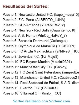 Lista de participantes: Manchester United F.C. (Cuatriloco21), Villarreal CF (Kmilo_FCC), Manchester City F.C. (Gabloy), FC Bayern Munich (Maldini0301), A.S. Roma (PrInCe_HaRdY_7), Borussia Dortmund (Carlosguz), Olympique de Marseille (LSCB2009), Juventus F.C. (FZ-Maju9), FC Zenit Saint Petersburg (jumpedEel), FC Anzhi Makhachkala (aNdReS_TICO), Everton F.C. (FZ-RoKa), F.C. Porto (ALBERTO_LUNA), Club América (x_RaMiReZ_x), Real Sociedad de Fútbol, S.A.D. (liam098), New York Red Bulls (Cuauhtemoc10), Newcastle United F.C. (kapo_messi10).