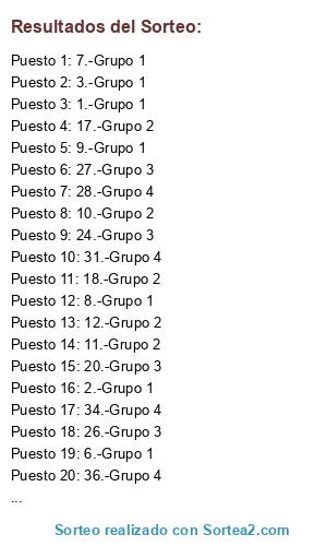 Lista de participantes: 1.-Grupo 1, 2.-Grupo 1, 3.-Grupo 1, 4.-Grupo 1, 5.-Grupo 1, 6.-Grupo 1, 7.-Grupo 1, 8.-Grupo 1, 9.-Grupo 1, 10.-Grupo 2, 11.-Grupo 2, 12.-Grupo 2, 13.-Grupo 2, 14.-Grupo 2, 15.-Grupo 2, 16.-Grupo 2, 17.-Grupo 2, 18.-Grupo 2, 19.-Grupo 3, 20.-Grupo 3, 21.-Grupo 3, 22.-Grupo 3, 23.-Grupo 3, 24.-Grupo 3, 25.-Grupo 3, 26.-Grupo 3, 27.-Grupo 3, 28.-Grupo 4, 29.-Grupo 4, 30.-Grupo 4, 31.-Grupo 4, 32.-Grupo 4, 33.-Grupo 4, 34.-Grupo 4, 35.-Grupo 4, 36.-Grupo 4, 37.-Grupo 4.