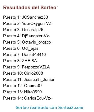 Lista de participantes: CarlosEdu-Vz-, JCSanchez33, Cirilo2008, DanielZS410, DjSangster-Vz-, FerpozzoVZLA, Jossuath_Junior, Niko0599, Oct_6jas, Octavio_orozco, Osama07, Oscarale26, YourOxygen-VZ-, ZHE-8A.