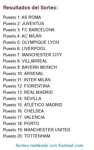 Lista de participantes: ÁRSENAL, REAL MADRID, LIVERPOOL, MANCHESTER CITY, FC BARCELONA, BAYERN MUNICH, CHELSEA, FIORENTINA, INTER MILÁN, MANCHESTER UNITED, AC MILÁN, TOTTENHAM, VILLARREAL, AS ROMA, SEVILLA, JUVENTUS, VALENCIA, OLYMPIQUE LYON, ATLÉTICO MADRID, PORTO.
