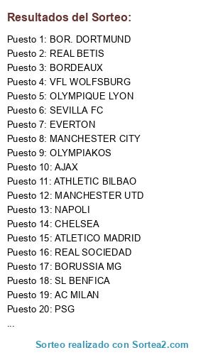 Lista de participantes: AC MILAN, ATHLETIC BILBAO, LIVERPOOL, MANCHESTER CITY, MANCHESTER UTD, NAPOLI, OLYMPIAKOS, REAL BETIS, REAL MADRID CF, REAL SOCIEDAD, SL BENFICA, VFL WOLFSBURG, AJAX, ARSENAL, ATLETICO MADRID, BOR. DORTMUND, BORDEAUX, BORUSSIA MG, CHELSEA, EVERTON, OLYMPIQUE LYON, PSG, SAMPDORIA, SEVILLA FC, UD LAS PALMAS, WERDER BREMEN.