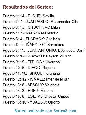 Lista de participantes: 1.- IÑAKY: F.C. Barcelona, 2.- RAFA: Real Madrid, 3.- EDER: Ársenal, 4.- ELCRACK: Chelsea, 5.- LOL: Manchester United, 6.- DIEGO: Napoles, 7.- JUANPABLO: Manchester City, 8.- APACHY: Valencia, 9.- GUAYAYO: Bayern Munich, 10.- SHOJI: Fiorentina, 11.- JUAN ANTONIO: Bourussia Dortmund, 12.- ISMAEL: Inter de Milan, 13.- CHUCHI: AC Milán, 14.- ELCHE: Sevilla, 15.- TITHOS : Liverpool, 16.- YDALGO: Oporto.
