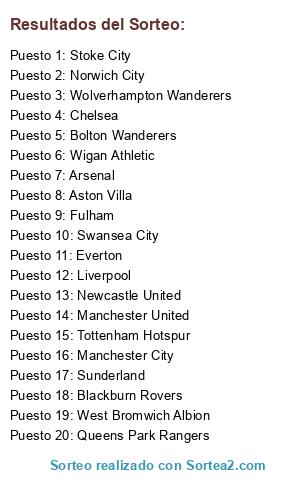 Lista de participantes: Arsenal, Aston Villa, Blackburn Rovers, Bolton Wanderers, Chelsea, Everton, Fulham, Liverpool, Manchester City, Manchester United, Newcastle United, Norwich City, Queens Park Rangers, Stoke City, Sunderland, Swansea City, Tottenham Hotspur, West Bromwich Albion, Wigan Athletic, Wolverhampton Wanderers.