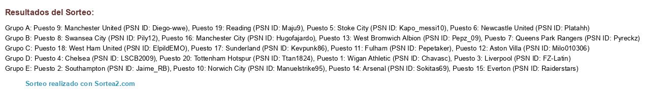 Lista de participantes: Puesto 1: Wigan Athletic (PSN ID: Chavasc), Puesto 2: Southampton (PSN ID: Jaime_RB), Puesto 3: Liverpool (PSN ID: FZ-Latin), Puesto 4: Chelsea (PSN ID: LSCB2009), Puesto 5: Stoke City (PSN ID: Kapo_messi10), Puesto 6: Newcastle United (PSN ID: Platahh), Puesto 7: Queens Park Rangers (PSN ID: Pyreckz), Puesto 8: Swansea City (PSN ID: Pily12), Puesto 9: Manchester United (PSN ID: Diego-wwe), Puesto 10: Norwich City (PSN ID: Manuelstrike95), Puesto 11: Fulham (PSN ID: Pepetaker), Puesto 12: Aston Villa (PSN ID: Milo010306), Puesto 13: West Bromwich Albion (PSN ID: Pepz_09), Puesto 14: Arsenal (PSN ID: Sokitas69), Puesto 15: Everton (PSN ID: Raiderstars), Puesto 16: Manchester City (PSN ID: Hugofajardo), Puesto 17: Sunderland (PSN ID: Kevpunk86), Puesto 18: West Ham United (PSN ID: ElpildEMO), Puesto 19: Reading (PSN ID: Maju9), Puesto 20: Tottenham Hotspur (PSN ID: Ttan1824).