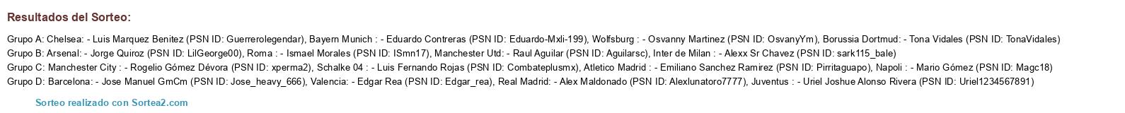 Lista de participantes: Arsenal: - Jorge Quiroz (PSN ID: LilGeorge00), Chelsea: - Luis Marquez Benitez (PSN ID: Guerrerolegendar), Manchester City : - Rogelio Gómez Dévora (PSN ID: xperma2), Manchester Utd: - Raul Aguilar (PSN ID: Aguilarsc), Inter de Milan : - Alexx Sr Chavez (PSN ID: sark115_bale), Juventus : - Uriel Joshue Alonso Rivera (PSN ID: Uriel1234567891), Napoli : - Mario Gómez (PSN ID: Magc18), Roma : - Ismael Morales (PSN ID: ISmn17), Borussia Dortmud: - Tona Vidales (PSN ID: TonaVidales), Bayern Munich : - Eduardo Contreras (PSN ID: Eduardo-Mxli-199), Schalke 04 : - Luis Fernando Rojas (PSN ID: Combateplusmx), Wolfsburg : - Osvanny Martinez (PSN ID: OsvanyYm), Atletico Madrid : - Emiliano Sanchez Ramirez (PSN ID: Pirritaguapo), Barcelona: - Jose Manuel GmCm (PSN ID: Jose_heavy_666), Real Madrid: - Alex Maldonado (PSN ID: Alexlunatoro7777), Valencia: - Edgar Rea (PSN ID: Edgar_rea).